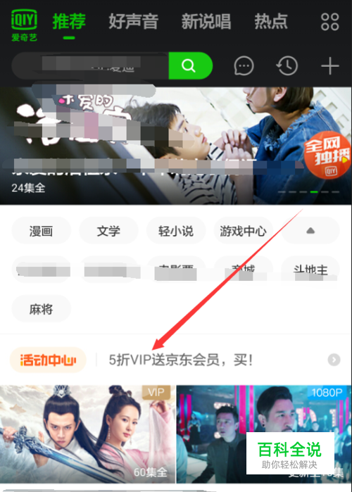打开爱奇艺app并成功登录后,直接点击首界面里的活动中心【5折vip送京东会员】,如下图所示。