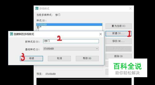 这时会弹出一个多线样式面板,点击新建,这时会弹出设置新的多线样式面板,写上样式名(2移门),点击继续。如下图所示的顺序。