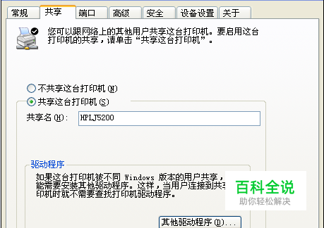 右键单击【打印机——属性】,在“属性”的对话框里选择第二个【共享】选项,确保打印机是处于共享状态的。