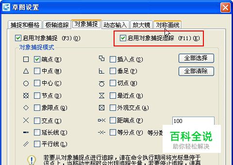 启动对象捕捉追踪可以按下底部状态栏的对象追踪按钮或按F11,要使用对象追踪,需要启动对象捕捉。对于通过输入命令修饰符、点捕捉工具栏按钮、SHIFT+右键菜单临时捕捉的点无法进行对象跟踪。