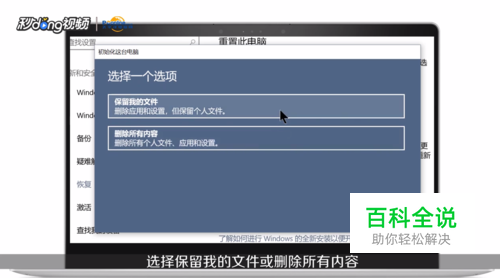 再恢复中重置此电脑,点击开始,选择保留我的文件或删除所有内容。