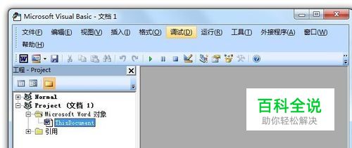 打开Word 2007,按Alt+F11。这时会出现一个Visual Basic编辑窗口。如图所示: