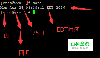 如图显示,date命令会输出 周几 几月 几日 时间 和 时间显示格式 和年份