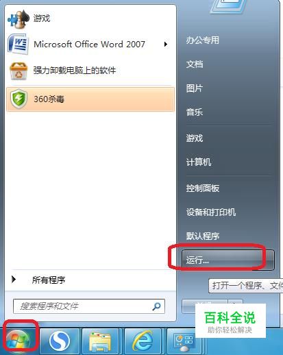 首先,我们点击开始菜单,点击“运行”。