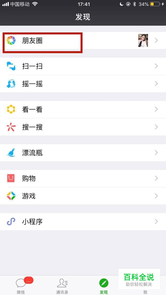 首先点击微信中的朋友圈,如下图所示。