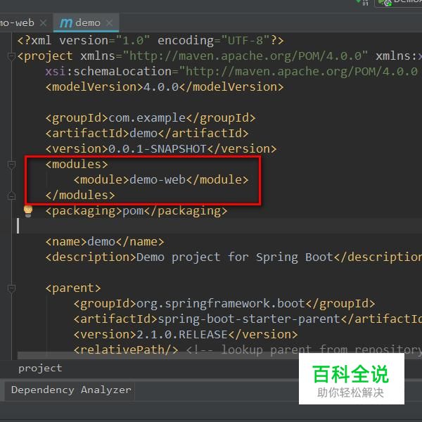 父目录demo下除了demo-web子模块、pom.xml文件、.gitignore文件外其他文件都可以删除了,原来src下的测试代码也可以不用保留了。创建完子项目后我们再一次打开父pom文件,发现自动帮我们添加了module,如下图所示。