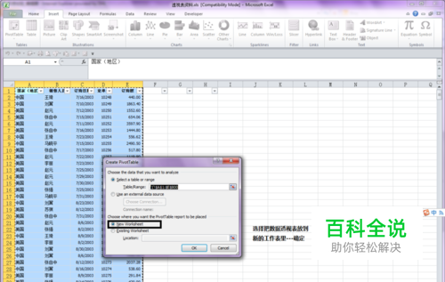 打开创建数据透视表对话框,选择把数据透视表放到新的工作表里---确定