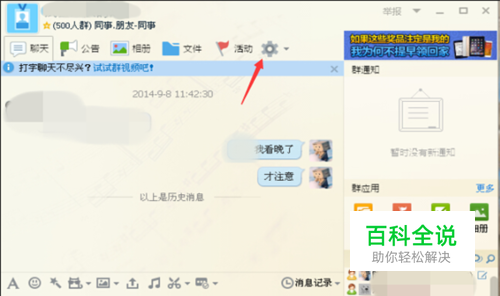 点进去之后就是你QQ群的对话框。我们这个时候可以看到界面的右上方有一个齿轮形状的按钮,我们点击进入。