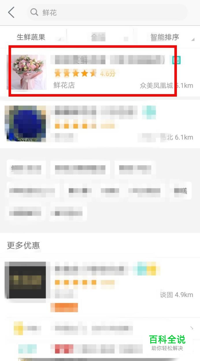 然后在搜索框中输入鲜花,下面会显示很多的花店,点击一个进入选购鲜花!