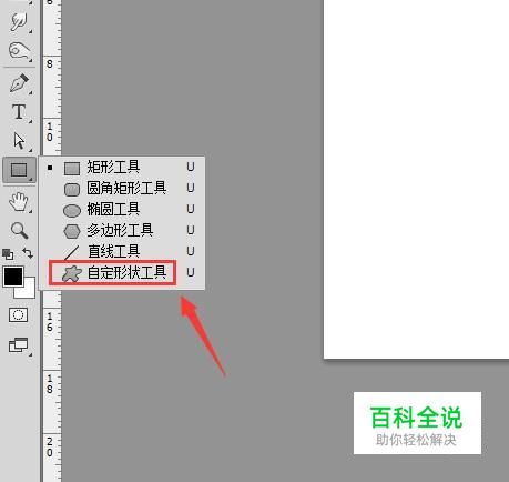 打开ps新建一个文件,然后在工具箱内找到矩形选项,点击该选项在其下拉列表里找到自定义形状选项,如图所示:
