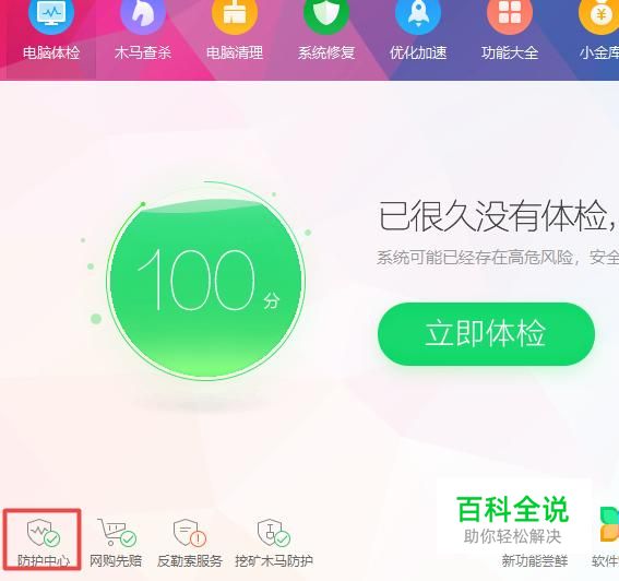 首先,我们打开我们的电脑,然后我们打开我们电脑上面的360安全卫士,之后我们点击防护中心;