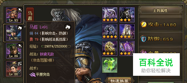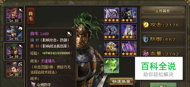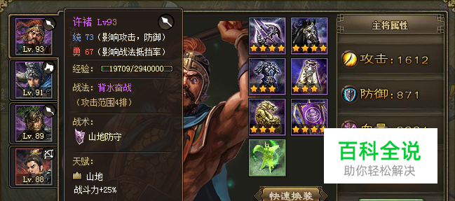 【将领属性】(参考) 许褚:93级、统73、勇67、攻击1612、防御871、血量3224; 典韦:89级、统97、勇43、攻击2176、防御667、血量2792; 甘宁:88级、统38、勇82、攻击1777、防御656、血量3384; 马超:91级、统64、勇79、攻击1480、防御659、血量3528; 【排兵布阵】 许褚、典韦、甘宁、马超 【胜利条件】 典韦战法不被挡胜; 典韦战法被挡,许褚和甘宁挡住对方战法胜; 获胜概率:70%左右;