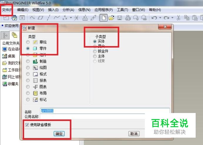 如下图所示, 打开Pro/e5.0软件, 首先点击标题栏中的“文件”, 然后在其展开的下拉菜单中点击“新建”, 然后在弹出的“新建”对话框中选择我们需要的设置:类型为零件,子类型为实体, 然后勾选下方的“使用缺省模板”, 然后“确定”。