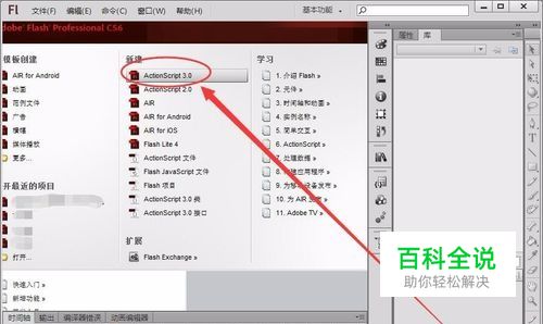 打开Flash软件,选择“ActionScript3.0”选项,新建一个空白文档。