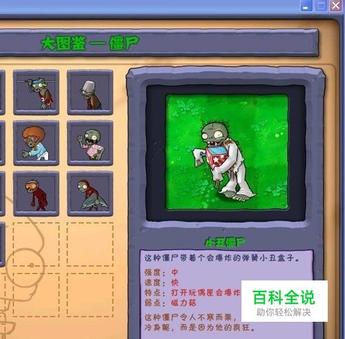 小丑僵尸,这种僵尸带着个会爆炸的弹簧小丑盒子。强度中等,速度较快,克星是磁力菇,不过磁力菇还没出现,后面的关卡中出现了再介绍,这种僵尸目前暂时是无解状态,不过也不用太过担心,还是在游戏中看看其效果吧!