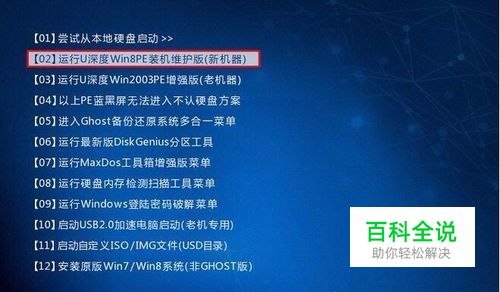 将制作完成u深度u盘启动盘连接至电脑,重启电脑等待出现开机画面时按下启动快捷键进入启动项窗口,选择【02】运行U深度Win8PE装机维护版(新机器),按回车键确认,如下图所示: