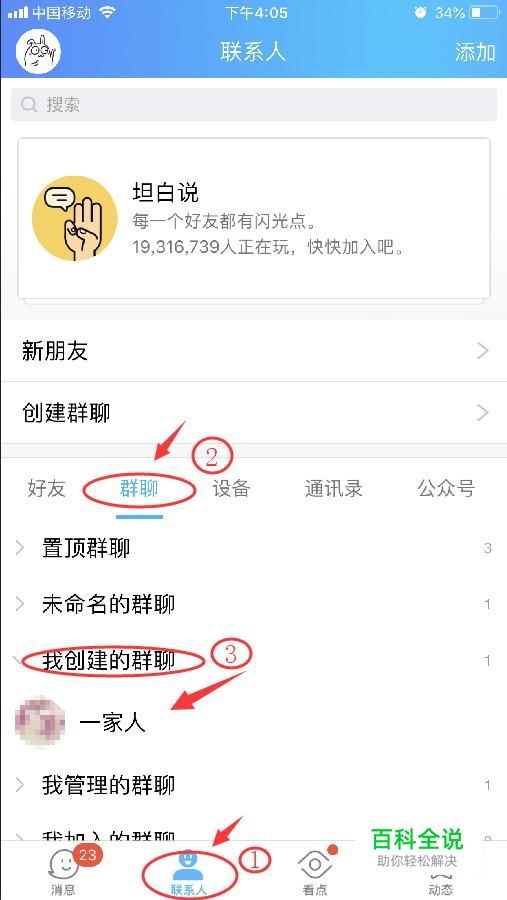 打开腾讯qq,点击“联系人”里面的“群聊”,选一个你想换群头像的群,我拿自己创建的群为例,操作都是一样的,如图点击“我创建的群聊”里面的“一家人”
