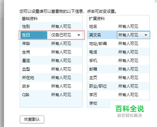 点击生日后面的选项,找到“仅自己可见”,见下图