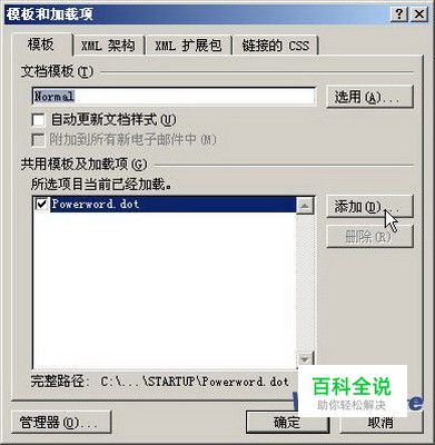 在打开的Word 2007“模板和加载项”对话框中切换到“模板”选项卡,然后在“共用模板及加载项”区域单击“添加”按钮,如图所示。 单击Word 2007“添加”按钮