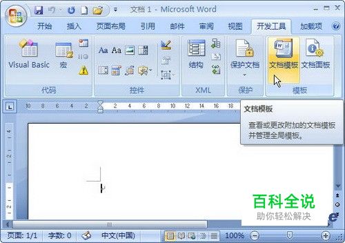 打开Word 2007文档窗口,切换到“开发工具”功能区。在“模板”分组中单击“文档模板”按钮,如图所示。 单击Word 2007“文档模板”按钮
