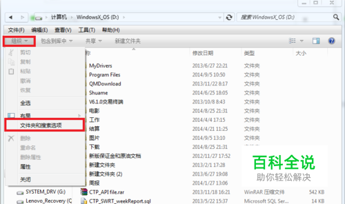 首先 我们需要点击组织,在下拉框中选择文件夹和搜索选项