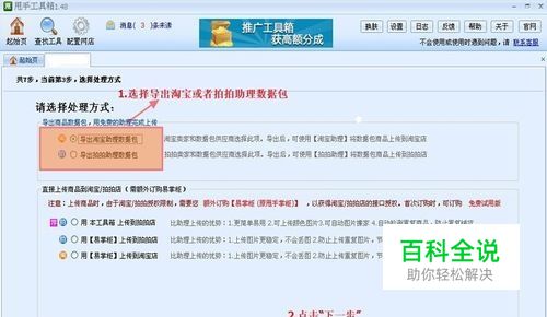 导出。请选择导出数据包位置、导出文件类型及商品描述图片处理方式,再点击“导出”按钮 注:以下有4种处理商品描述图的方式,请详细查看每个处理方式后面的文字介绍,以便您的选择