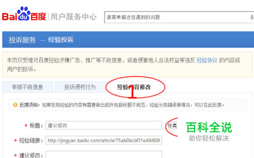 进入百度经验投诉中心,依次选择“经验内容修改”--“分类”--“标题不规范” 如图: