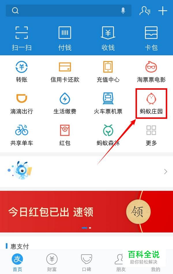 首先打开支付宝,找到蚂蚁庄园的按钮图标,点击进入;