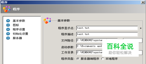 基本参数:是指显示程序的名称、路径、启动参数等信息 程序类型:是指远程客户端访问应用程序时调用的应用程序的位置 服务器端程序---异速联用户调用的是服务器端发布出来的应用程序 本地程序---异速联用户调用的是本地电脑上应用程序 注:除非很清楚【程序类型】这一功能,否则请按系统默认方式进行配置,无须改动; 程序设置:是指远程客户端访问该软件时需要进行与本地进行交互的一些设置。