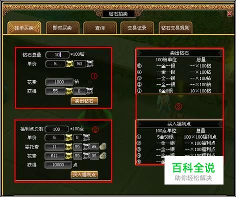 钻石拍卖流程 点击【挂单买卖】栏,将会看到以下界面,如下图所示:在【挂单买卖】栏中,在①号框内,玩家以100钻为单位输入需要卖出的钻石数量和该单位的金币在②号框内,玩家以福利点数100点为单位输入需购买的福利点数数量和该单位的金币单价,买入福利点数需花费一定委托费用,同时系统会自动结算出此笔挂单的福利点和金币总数,最后点击买入福利点,系统将弹出此笔挂单的信息界面,确认后即可形成挂单,界面如下:在③号框内,分别显示的是【卖出钻石】以100钻为单位,金价最便宜的前5项和【买入福利点】以100点为单位,金价最高的前5项 2、 点击【即时买卖】选项将会弹出以下界面,如下图所示: 3、点击【钻石购买金币】按键,将弹出以下界面,如下图所示:当玩家以100钻为单位进行购买金币,系统会自动形成最便宜的金币购买,在没有玩家出售金币的情况下,系统会以当前服务器的默认价格询问玩家是否进行挂单购买,在玩家同意的情况下,则会形成挂单,形成的挂单可在查询界面中查看。 4、点击【金币购买福利点】按键,将弹出以下界面,如下图所示:系统会自动形成最便宜的福利点数购买,在没有玩家出售福利点的情况下,系统会以当前服务器的默认价格询问玩家是否进行挂单购买,在玩家同意的情况下,则会形成挂单,形成的挂单可在查询界面中查看。 5、 点击【查询】栏,玩家可以看到自己所拍卖的钻石和金币的挂单以及取消寄卖功能,具体如 6、 点击【交易记录】栏,玩家可以看到自己所完成的钻石交易历史记录,历史记录只保留最新的30条记录,保存时间为7天