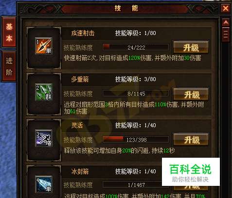 9377奇迹来了弓箭手,她们天生身手矫健,反应极其灵敏,使用弓箭武器。她们不仅会所有射术,而且还学会与自然之灵交流,会使用各种自然的力量赋予箭矢特殊的攻击效果。那么弓箭手的技能有哪些呢下面来解析下奇迹来了弓箭手技能。 奇迹来了弓箭手性别女,使用弓箭武器,会所有射术。她们的技能分基本技能和进阶技能两种,基本技能有疾速射击、多重箭、灵活、冰封箭、翻滚、治疗、星灵祈祷7个,进阶技能有箭雨、精灵恩泽、守护之光、穿透箭、战神之力、战争号角6个。下面来看看这些技能的效果。 疾速射击:快速射箭2次,对目标造成120%伤害,并额外附加30伤害。 多重箭:远程对扇形范围3格内所有目标造成110%伤害,并额外附加61伤害。 灵活:释放该技能可增加自身20%的闪避,持续12秒。 冰封箭:远程对目标造成100%伤害,并额外附加142伤害,并且70%几率降低40%的移动速度,效果持续8秒。 翻滚:弓箭手依靠天天生机敏来灵魂躲避敌人的攻击,向鼠标悬停方向进行一次快速翻滚。 治疗:在星灵祈祷下恢复自身或队友的生命,恢复的量为使用星灵后攻击力的30%和智力值的180%之和。 星灵祈祷:可转为智力型辅助,该状态下减少60%攻击力(该值随之力的增加而递减,最少10%),同时敏捷属性会额外增加攻击。 箭雨:对自身范围4格内所有目标造成100%伤害,并额外附加25伤害。 精灵恩泽:精灵王索兰达的恩赐,短时间内使自身提高10%的物理攻击力及5%的暴击几率,持续12秒。 守护之光:在星灵祈祷下增加自身或队友的防御,增加的量为使用星灵前攻击力的7%和智力值的7%之和,效果持续90秒。 穿透箭:对自身上6格的目标造成115%的伤害,并额外附加142伤害。 战神之力:在短时间内增加自身或队友的攻击力,提升的攻击力为角色使用星灵祈祷前攻击力的5%和智力值的30%之和,效果持续90秒。 战争号角:召唤一只黑甲战龙,属性随着技能等级提升而增强,持续120秒。 奇迹来了弓箭手技能效果是如此地炫酷,快来释放吧!奇迹来了职业的基本技能只要技能熟练度满便可升级,提升技能需要消耗魔魂和金币;而进阶技能需要对应的技能书方可学习,可在商城购买技能书。为了更高的战斗力,速来提升技能等级。