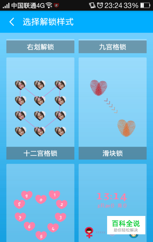 第三步选择滑动锁解锁样式即可,然后可选择自己喜欢额图案设置成滑块锁的解锁图案