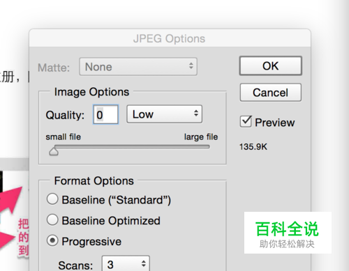 在点击“确定”后会出现图片控制文件大小的调节器,调到最小。在这个调节器又边显示文件的大小。