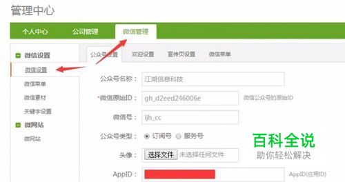 进入用户管理中心页面,点击“微信管理 -- 微信设置 -- 公众号设置”