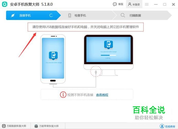 安装软件完毕,运行软件,我们可以看到提示“将USB数据线连接手机和电脑,并关闭电脑上的其它的手机管理软件”,按照操作执行即可。