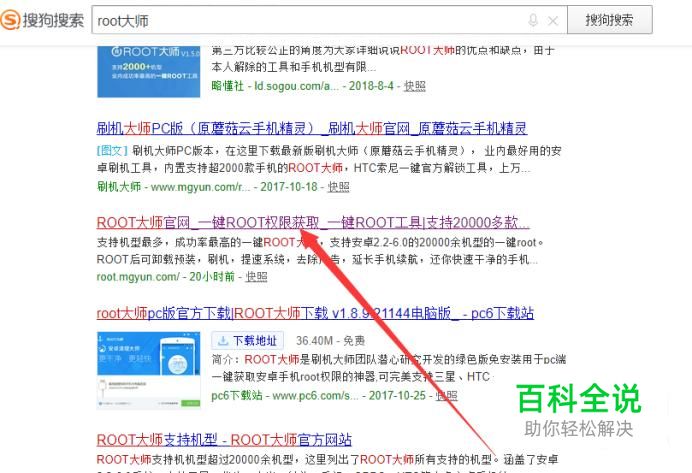 打开电脑,进入搜狗浏览器,搜索“root大师”,点击并进入,如图所示。