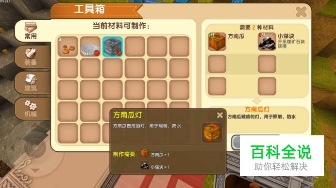 方南瓜灯是由小煤块和方南瓜合成的,因此我们需要分别获取这两样物品。