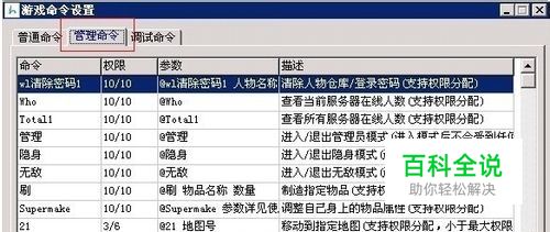 在管理命令界面里,我们可以看见GM使用的命令界面, 还有命令设置,权限设置,命令功能,命令格式. 那如何更改命令呢? 找到需要更改的命令功能,点击再在命令名称里修改. 如图: