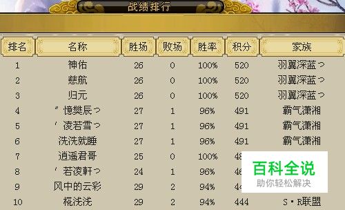 NO.1神佑 26胜场 0败场 100%胜率 积分520 来自家族羽翼深蓝