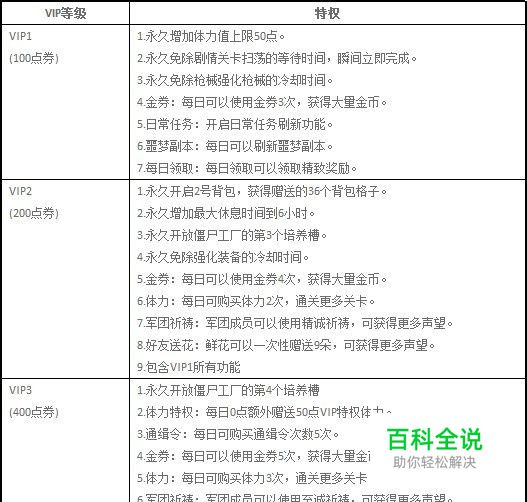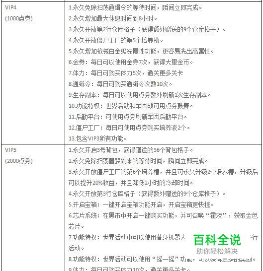 《枪魂》VIP系统的等级及其特权: 1、VIP1(100点券): 永久增加体力值上限50点。 永久免除剧情关卡扫荡的等待时间,瞬间立即完成。 永久免除枪械强化枪械的冷却时间。 金券:每日可以使用金券3次,获得大量金币。 日常任务:开启日常任务刷新功能。 噩梦副本:每日可以刷新噩梦副本。 每日领取:每日领取可以领取精致奖励。 2、VIP2(200点券): 永久开启2号背包,获得赠送的36个背包格子。 永久增加最大休息时间到6小时。 永久开放僵尸工厂的第3个培养槽。 永久免除强化装备的冷却时间。 金券:每日可以使用金券4次,获得大量金币。 体力:每日可购买体力2次,通关更多关卡。 军团祈祷:军团成员可以使用精诚祈祷,可获得更多声望。 好友送花:鲜花可以一次性赠送9朵,可获得更多声望。 包含VIP1所有功能。 3、VIP3(400点券): 永久开放僵尸工厂的第4个培养槽。 体力特权:每日0点额外赠送50点VIP特权体力。 通缉令:每日可购买通缉令次数5次。 金券:每日可以使用金券5次,获得大量金币。 体力:每日可购买体力3次,通关更多关卡。 军团祈祷:军团成员可以使用至诚祈祷,可获得更多声望。 每日领取:每日领取可以领取卓越奖励。 好友送花:鲜花可以一次性赠送99朵,可获得更多声望。 包含VIP2所有功能。 4、VIP4(1000点券): 永久免除扫荡通缉令的等待时间,瞬间立即完成。 永久增加最大休息时间到8小时。 永久开放第2行仓库格子(获得额外赠送的9个仓库格子)。 永久开放僵尸工厂的第5个培养槽。 永久增加枪械白金级洗属性功能,更容易洗出高属性。 金券:每日可以使用金券7次,获得大量金币。 体力:每日可购买体力5次,通关更多关卡。 通缉令:每日可购买通缉令次数10次。 生存副本:每日可以使用点券额外刷新1次生存副本。 功能特权:世界活动和军团战可用点券鼓舞。 后勤平台:可使用点券刷新军团后勤平台。 僵尸工厂:每日可使用点券购买培养液2个。 包含VIP3所有功能。 5、VIP5(2000点券): 永久开启3号背包,获得赠送的36个背包格子。 永久免除扫荡噩梦副本的等待时间,瞬间立即完成。 永久开放僵尸工厂的第6个培养槽,并且可永久升级2个培养槽,升级后可以提升20%收益,并且降低2小时的冷却时间。 永久开放第3行仓库格子(获得额外赠送的9个仓库格子)。 开启宝箱:一键开启宝箱功能开启,开启宝箱更快捷。 芯片系统:在黑市中开启一键购买功能,并可召唤“霍茨”,获取金色芯片。 功能特权:世界活动中可以使用替身机器人,无需在线,即可自动进行活动。 功能特权:世界活动可以使用“摇一摇”功能,可以获得更多的奖励。 体力:每日可购买体力10次,通关更多关卡。 金券:每日可以使用金券9次,获得大量金币。 僵尸工厂:每日可购买培养液6个,并且可使用点券直接满级。 包含VIP4所有功能。 6、VIP6(5000点券): 永久增加最大休息时间到12小时。 永久开放第4行仓库格子(获得额外赠送的9个仓库格子)。 永久开放僵尸工厂所有的培养槽,并且可永久升级4个培养槽,升级后可提升20%收益,并且降低2小时冷却时间。 永久增加枪械钻石级洗属性功能,更容易洗出高属性。 一键合成:宝石图纸可直接合成2-7级宝石,基因图纸可直接合成基因。 一键合成:重铸图纸直接完成,重铸图纸可用点券补足缺失的材料。 枪械同步:可使用完美枪械同步功能。 物资押送:押送物资中可以使用点券直接召唤出钻石物资。 金券:每日可以使用金券30次,获得大量金币。 体力:每日可购买体力15次,通关更多关卡。 通缉令:每日可购买通缉令次数20次。 僵尸工厂:每日可使用点券购买培养液10个。 生存副本:每日可以使用点券额外刷新2次生存副本。 包含VIP5所有功能。 7、VIP7(10000点券): 永久开启4号背包,获得赠送的36个背包格子。 永久开放第5行仓库格子(获得额外赠送的9个仓库格子)。 永久增加枪械至尊级洗属性,属性只加不减。 可升级僵尸工厂中的6个培养槽,升级后可提升20%收益,并降低2小时冷却时间。 金券:每日可以使用金券45次,获得大量金币。 体力:每日可购买体力20次,通关更多关卡。 僵尸工厂:每日可使用点券购买培养液14个。 物资押送:押送物资前可以使用点券进行鼓舞。 包含VIP6所有功能。 8、VIP8(20000点券): 永久开放全部仓库格子。 可升级僵尸工厂的全部培养槽,升级后可提升20%收益,并降低2小时冷却时间。 物资押送:押送物资过程中可以使用点券直接到达终点。 日常任务:每日可以刷新日常任务2次。 金券:每日可以使用金券60次,获得大量金币。 通缉令:每日可购买通缉令次数30次。 僵尸工厂:每日可使用点券购买培养液18个。 生存副本:每日可以使用点券额外刷新3次生存副本。 包含VIP7所有功能。 9、VIP9(50000点券): 金券:每日可以使用金券80次,获得大量金币。 体力:每日可购买体力25次,通关更多关卡。 僵尸工厂:每日可使用点券购买培养液22个。 通缉令:每日可以购买通缉令次数40次。 噩梦副本:每日可刷新噩梦副本10次。 包含VIP8所有功能。 10、VIP10(100000点券): 永久增加最大休息时间到24小时。 金券:每日可以使用金券110次,获得大量金币。 僵尸工厂:每日可使用点券购买培养液26个。 通缉令:每日可以购买通缉令次数60次。 生存副本:每日可以使用点券额外刷新4次生存副本。 包含VIP9所有功能。 11、VIP11(200000点券): 金券:每日可以使用金券200次,获得大量金币。 通缉令:每日可以购买通