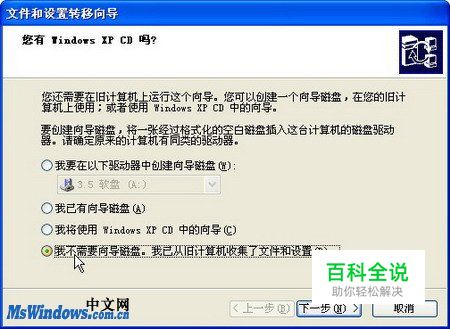 第3步,经过片刻间的准备工作,打开“您有Windows XP CD吗?”向导页。因为事先已经备份并保存了旧电脑的设置,所以选中“我不需要向导磁盘。我已从旧计算机备份了文件和设置”单选钮,并单击“下一步”按钮,如图2010040949所示。 图2010040949 选择运行转移向导的方式 小提示:如果Windows XP(SP2)启用了内置的防火墙,则会组织该向导的运行。在弹出的对话框中单击“解除阻止”按钮以允许该向导继续运行。