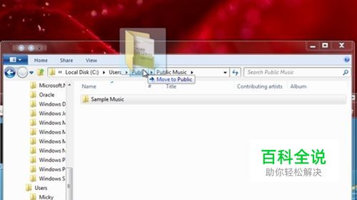 首先,是Windows 8资源管理器的一个新的拖放特性,Windows 8允许用户把文件夹或文件直接拖到地址栏中向上的任意一个节点处,在Vista和Windows 7中,若要实现相同的操作你需要将该文件复制或剪切,然后粘贴到这一位置。 如下图,你可以将示例音乐文件夹直接拖放到地址栏的Public文件夹下。虽然这个功能并非巨大变化,但是给用户的使用带来了更大的便利。