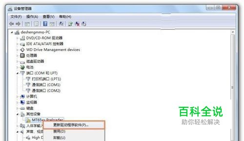 安装线刷驱动 • 打开设备管理器(我的电脑-属性-硬件-设备管理器) (XP系统的设备管理器在电脑 - 属性 - 硬件栏目下) • 将手机电池取下,按住 音量下键(或音量上键) ,再插入数据线, • 此时设备管理器会出现一个带问号的设备,对其右击“更新驱动程序” (有些手机可能会一闪而过,需要抓紧时间右击!)