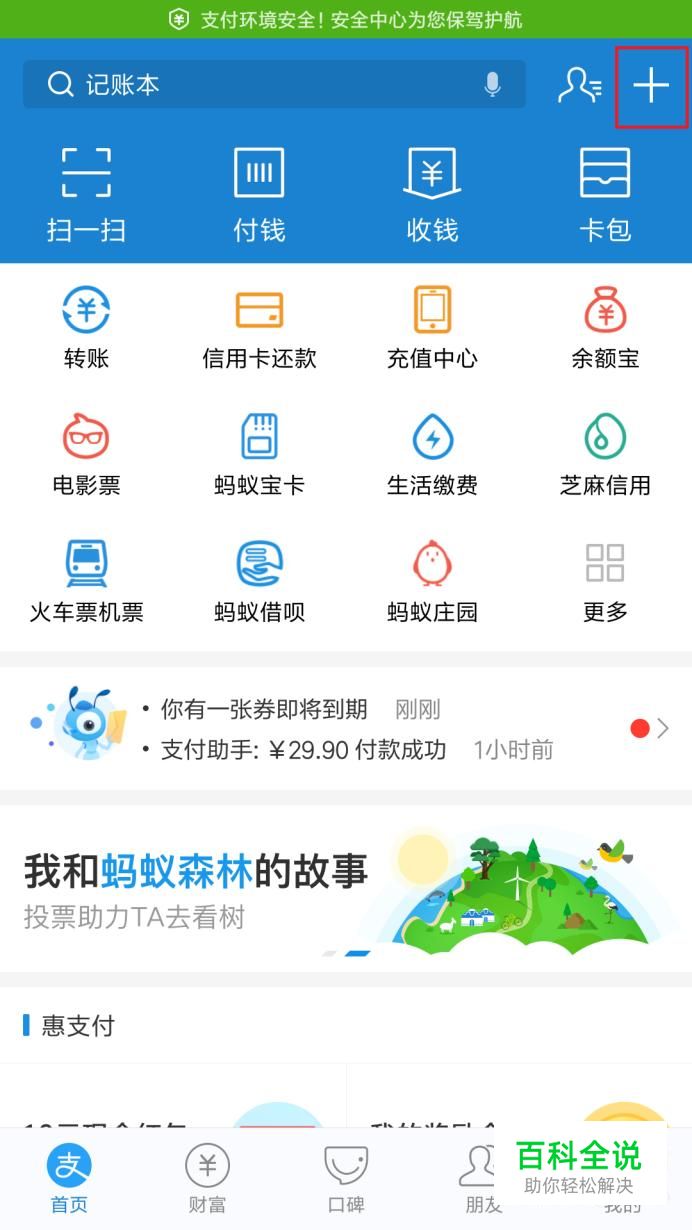 蚂蚁宝卡赚取流量只可以通过线下买单支付,打开支付宝客户端主页面,点击页面右上角“+”按钮。