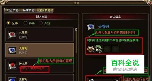 学习秘方 上面已经说到,每种药品都有属于自己的独特秘方,要配置这些药品,当然要先学习配置的秘方啦。除了九阳丹和天香丹等级达到会自动学习外,其他的药品在等级达到的同时还要配方卷才可学习。