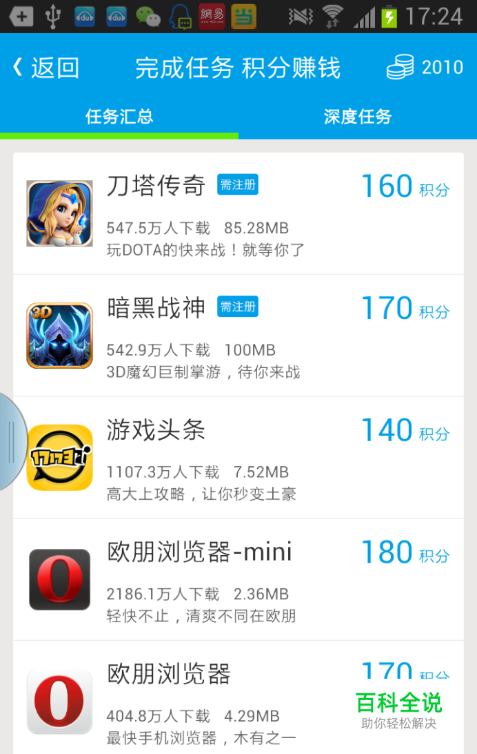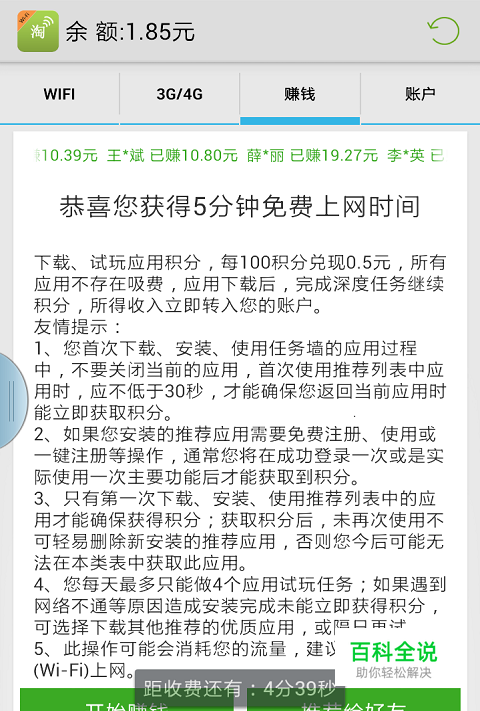 首先打开“赚钱”界面,点击“开始赚钱”,如图: 这时会出现任务墙界面,如图: 任务墙有两类任务:“任务汇总”和“深度任务”。下面分别来讲。 1.任务汇总 这里列出了所有你可以下载的应用,下载安装玩打开待上1分钟,再返回,你的积分就到手了。不需要进入应用做过多的操作。下载的应用尽量不要删除,因为下一步的深度任务需要的。 2.深度任务 深度任务的积分很好拿,一般分为: 1)试玩10秒或几分钟。如下图: 对这类任务,你首先需要点击这个任务,而后系统会启动相应的应用(如果没有安装或者被你删除了,系统提示你重新安装),当应用打开后,保持这个界面10秒或几分钟(按任务要求来,时间尽量长一点),这个过程根本不需要做过多操作,你可以去休息一下再回来。而后退出应用(点手机下面的“Home”或“返回”键),积分轻松到手。您可以先选时间短的任务来做,赚钱效率会高些。 2)n天后不卸载的任务,这类任务,你不要卸载这个应用就可以啦。