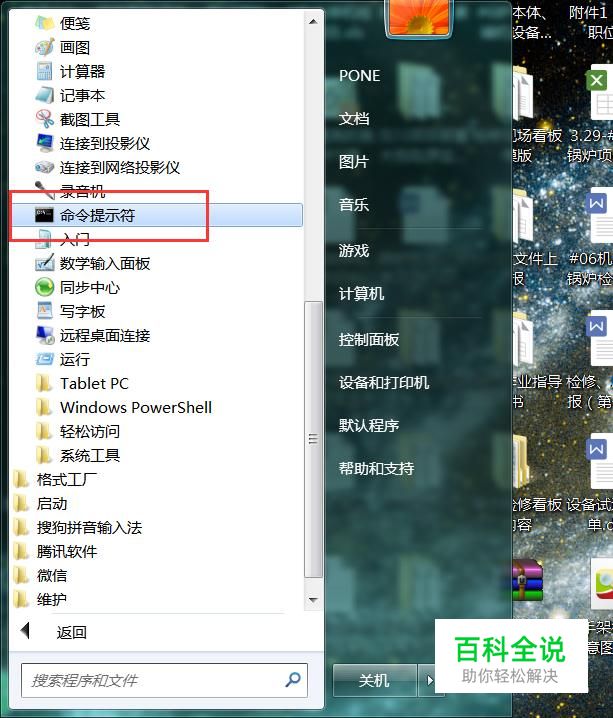 首先,点击操作系统中的开始菜单,在开始菜单列表中,找到“附件-命令行提示符”菜单选项。