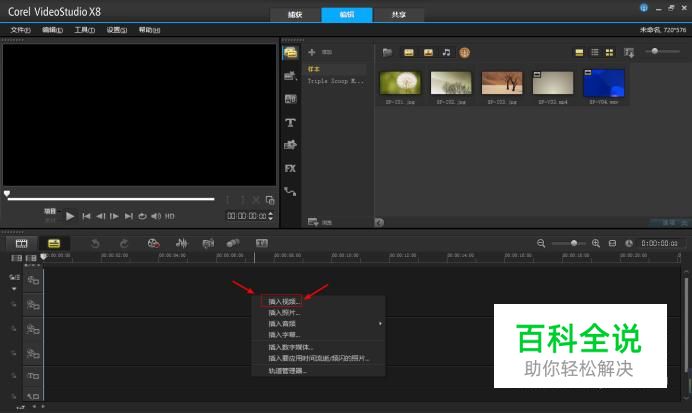 打开会声会影,鼠标移动到轨道,单击右键,选择插入视频