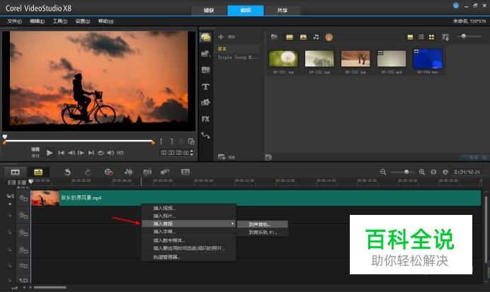同样,再单击鼠标右键,选择插入音频,到声音轨或音乐轨都可以