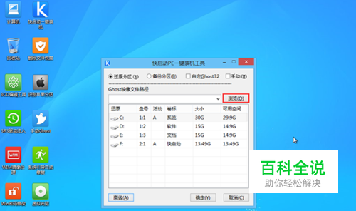 进入到pe系统桌面后,系统会自启快启动一键装机工具,在工具界面点击“浏览”按钮,如下图所示: